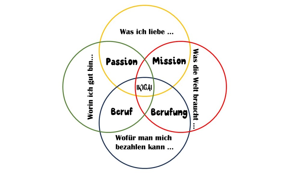Ikigai – ein Konzept für Lebenssinn und Erfüllung! Ein sog. „Überlagerungsdiagramm“, das spanische Wurzeln hat und in Japan zu einer Art Daseinsphilosophie weiterentwickelt wurde. Im Zentrum des mehrdimensionalen Modells stehen vier Schlüsselfragen: