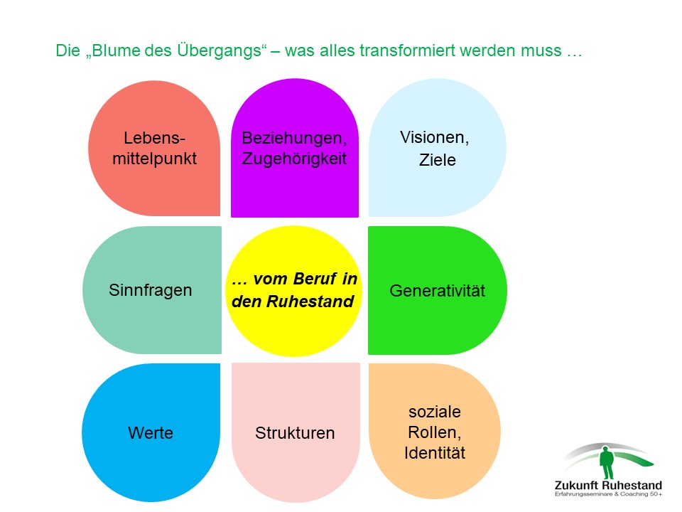 Was alles wird sich ohne unser Zutun verändern – ob wir wollen oder nicht? Wie können wir darauf Einfluss nehmen, damit uns diese neue Lebensphase zufrieden und glücklich macht? Welche Brücken müssen wir überqueren, um heil und vorbereitet am anderen Ende wieder an Land zu gehen? Gehen wir die einzelnen Blütenblätter unserer „Blume der Veränderung“ einmal durch …