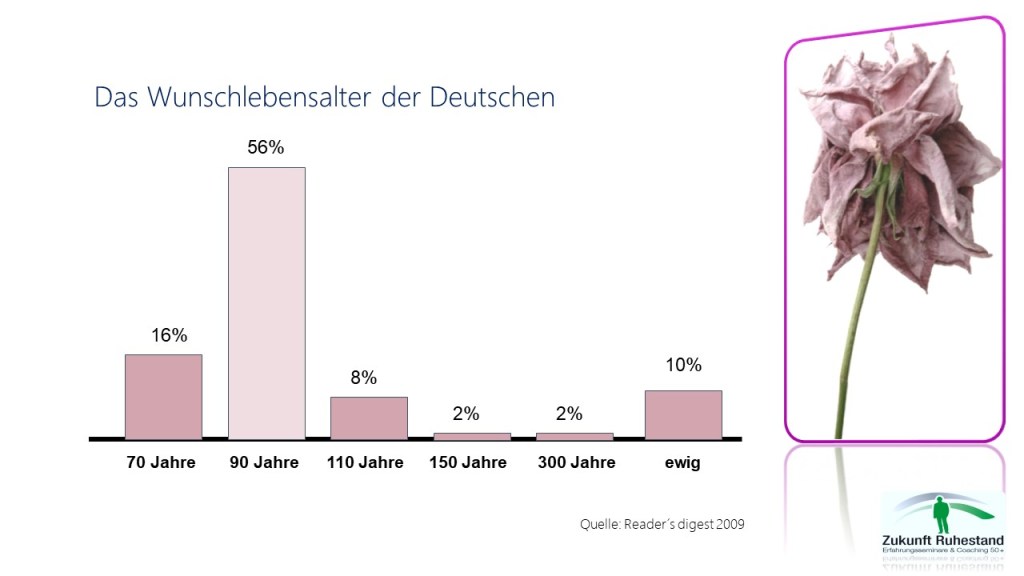 Im Jahre 2009 hat der Verlag Reader´s Digest eine Untersuchung initiiert, die die Lebenserwartungswünsche der Deutschen erfassen sollte. Die Teilnehmer hatten die Wahl, sich zwischen folgenden Alternativen zu entscheiden: Würden Sie gern 70 Jahre, 90 Jahre, 110 Jahre, 150 Jahre oder 300 Jahre alt werden oder ewig leben?