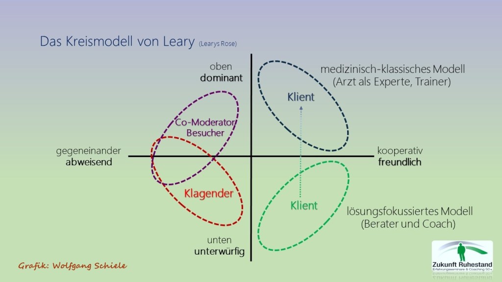 Da die lösungsorientierte Kurz(zeit)therapie immer das Gesamtsystem „Klient – Therapeut“/“Teilnehmer – Seminarleiter“ betrachtet, macht es Sinn, die Positionen von Therapeut/Trainer/Coach sowie Klient/Klagender/Besucher/Co-Moderator in einem Diagramm – hier der sog. „Leary-Rose“ – darzustellen. Leary´s Kreismodell pendelt auf der „Machtachse“ zwischen den Polen dominant und unterwürfig und auf der „Sympathieachse“ zwischen den Extremen freundlich und abweisend.