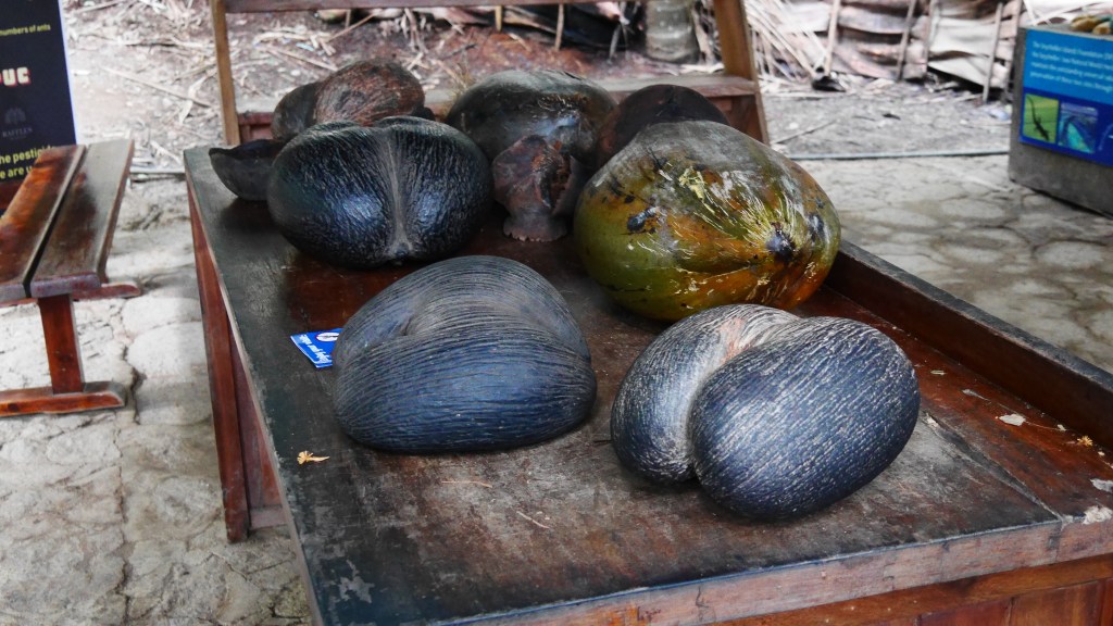 Die Coco de Mer kann – wenn man ein Zertifikat erwirbt – auch exportiert/importiert werden. Doch man sollte sich schon überlegen, ob man die Nuss der Nüsse wirklich noch über die nächsten Inseln mitschleppt … Und das böse Erwachen kommt spätestens dann, wenn die Fluglinie einen saftigen Aufschlag auf die Gepäckkosten verlangt …