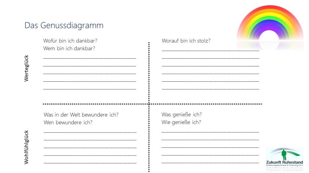 Testen Sie Ihre ganz persönliche „Genussfähigkeit“ an Hand des o. g. „Genussdiagrammes“. Füllen Sie die Zeilen mit Ihren Ideen zum „Werteglück“, das sich aus dem Dank und dem Stolz zusammensetzt, und dann die Zeilen des „Wohlfühlglückes“, das die Wunder der Welt und unser sinnliches Auskosten ausmachen. Und schauen Sie zum Schluss, ob sich eine harmonische Verteilung ergibt oder ob Sie noch Defizite ausgleichen sollten.