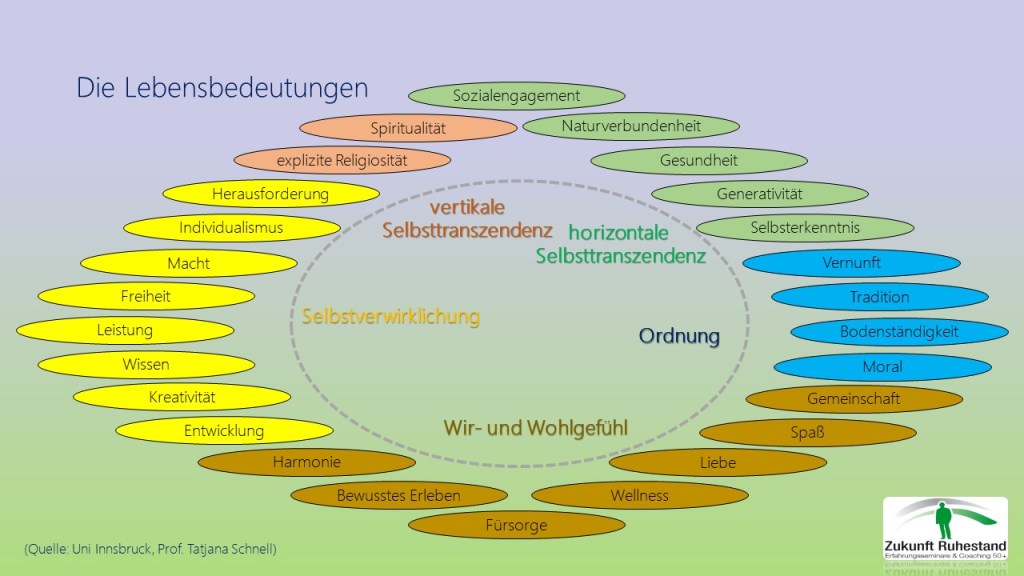 Neben dem vorliegenden Teil der „Sinnquellen für´s Alter(n)“ gibt es noch den Teil 1, der sich mit der SELBSTVERWIRKLICHUNG befasst (siehe auch https://wp.me/p7Pnay-2JI), und demnächst den dritten Teil, der zu den Gruppen ORDNUNG und WIR- und WOHLGEFÜHL weitere 11 Lebensbedeutungen bespricht.