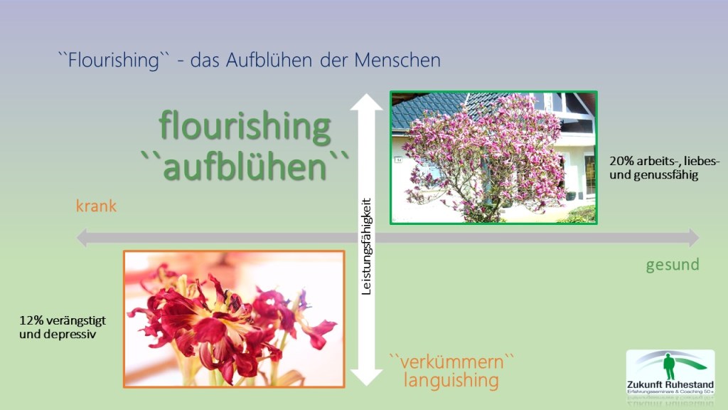 Was würden wir im Leben nicht alles dafür geben, uns wohlzufühlen! Und dennoch haben wir oftmals das Gefühl, dass es mit dem eigenen Wohlbefinden nicht all zu weit her ist – zu genervt, zu aufgeregt, zu flüchtig und zu unstet eilen und hasten wir durch die Welt und die Zeit. Und verpassen die Momente des persönlichen Aufblühens, auch „Flourishing“ genannt, um einen Begriff der Positiven Psychologie zu verwenden. Letztere hat sich zum Ziel gesetzt, alles dafür zu tun, dass Menschen nicht verkümmern, sondern aufblühen können. Doch dafür müssen ein paar Voraussetzungen erfüllt sein. Denn Studien zeigen, dass nur etwa 20% aller Menschen aufblühen, sich als „liebes-, arbeits- und genussfähig“ – also in jederlei Hinsicht als voll leistungsfähig – betrachten. Sollte es Ihnen im beruflichen Leben nicht beschieden gewesen sein, aufzublühen, dann holen Sie das doch einfach im Ruhestand nach!