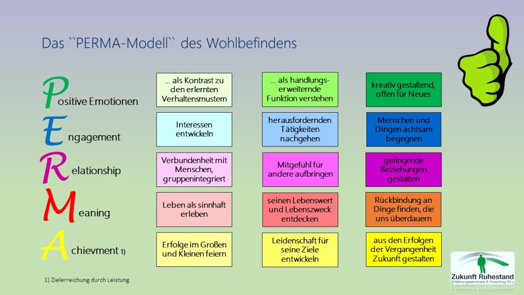 In seinem Buch „Flourish. Wie Menschen aufblühen“ (2012) stellt Martin Seligman, einer der Begründer der Positiven Psychologie, sein sog. „PERMA-Modell“ vor. Es leitet sich ab aus den Anfangsbuchstaben einer Reihe von Maßstäben und Werten, mit denen man das „Konstrukt Wohlbefinden“ gut beschreiben kann. Als da sind: