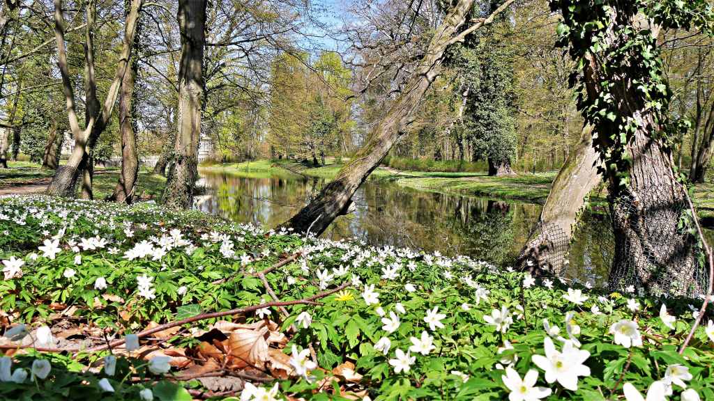 Der Zeitpunkt unseres Kommens war ideal: Die weißen Anemonen überdeckten die mehrere Hektar umfassene Parkanlage und brachten die Wiesen zum Strahlen in einem festlichen Glanz.