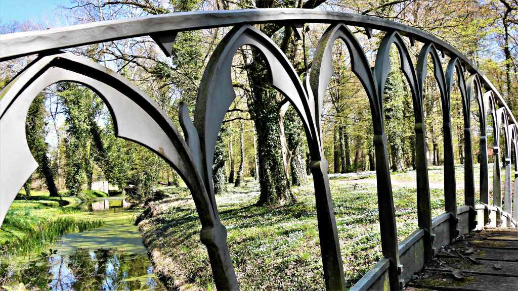Die kleinen, mehrheitlich künstlich angelegten Wasserläufe, werden durch viele romantische Brücken im neugotischen Stil überspannt.
