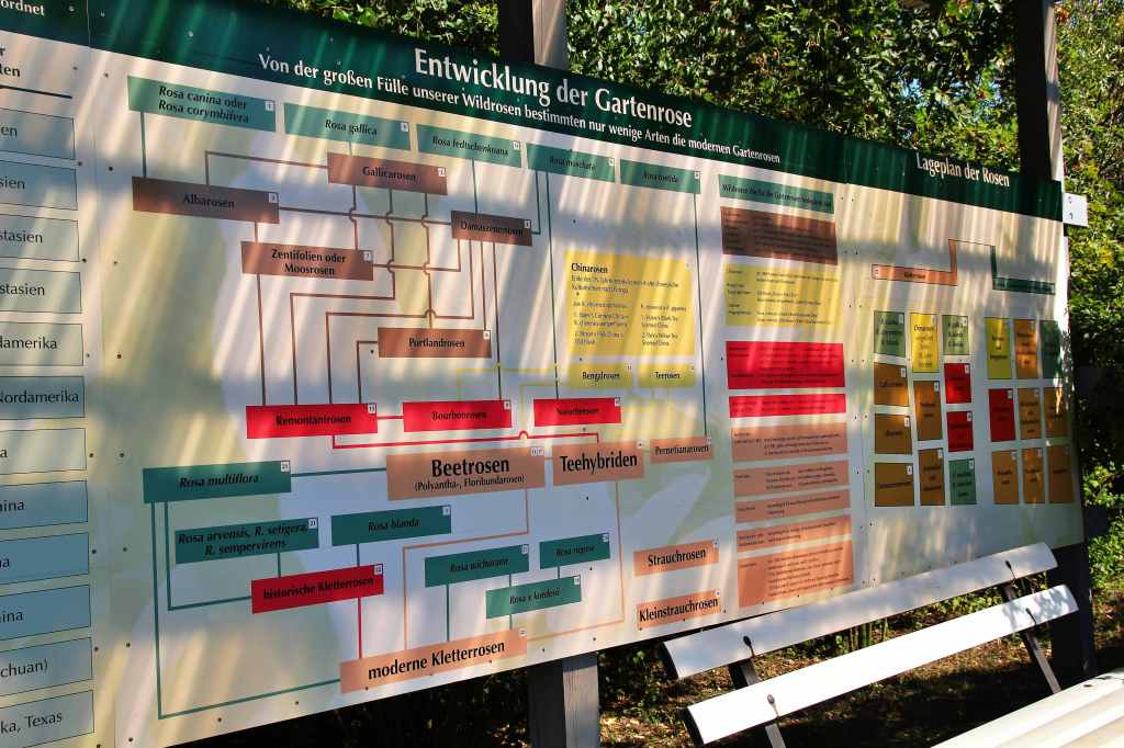 Auf einer großen Schautafel kann man sich über die Entwicklung der Gartenrose informieren und lernt Interessantes über die Züchtungsrichtungen, die die Vielfalt der Rosenarten und Rosenklassen ausmachen.