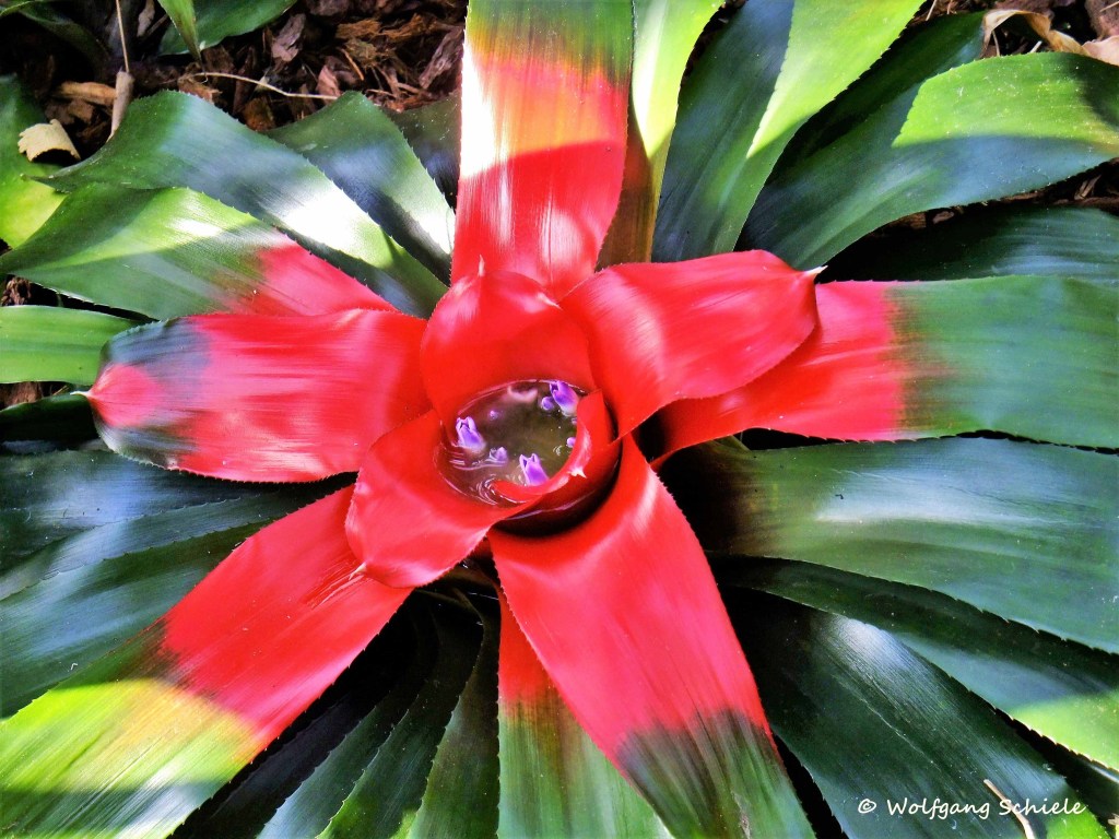 Die Bromelie sammelt und deponiert ihr Wasser im „Blütenkelch“ oder besser Blatttrichter – und nimmt auf diese Weise das Lebenselixier nach Bedarf auf.