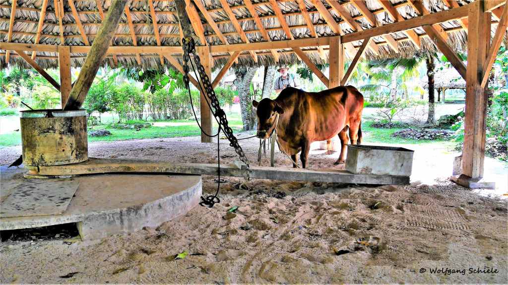 Diese Kuh verrichtet ihre Arbeit auf einer Cocos-Plantage auf den Seychellen, genauer gesagt auf La Digue