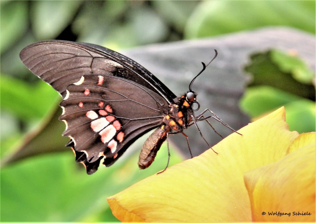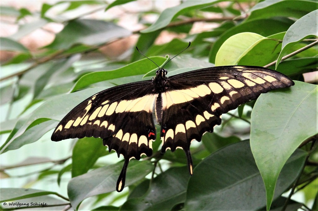 Ein Tiger-Langflügel auf einer Blüte bei der NektarsucheEine Weiße Baumnymphe mit markanter schwarzer Zeichnung – ein Edelfalter aus Südostasien, auf einer „Krabbenschere“ beim VerweilenEin Riesenschwalbenschwanz – er gehört wohl zur Familie der RitterfalterAuf einer aufgeschnittenen Banane entdeckt: der Blaue ScheckenfalterEin Glasflügel-Schmetterling ruht sich auf einem Blatt ausEine der vielen Ausstellungstafeln in Europas größter Schmetterlingsfarm in Trassenheide auf UsedomEin wunderschön posierender Tigerflügel mit halb geöffneten FlügelnEin Schmetterling aus der Familie der Mormonen vor einer HibiskusblüteUps, der hat sich einfach hier hinein gemogelt: eine angefressene Mosaikjungfer mit lädiertem Flügel, aber noch voll flugtauglich