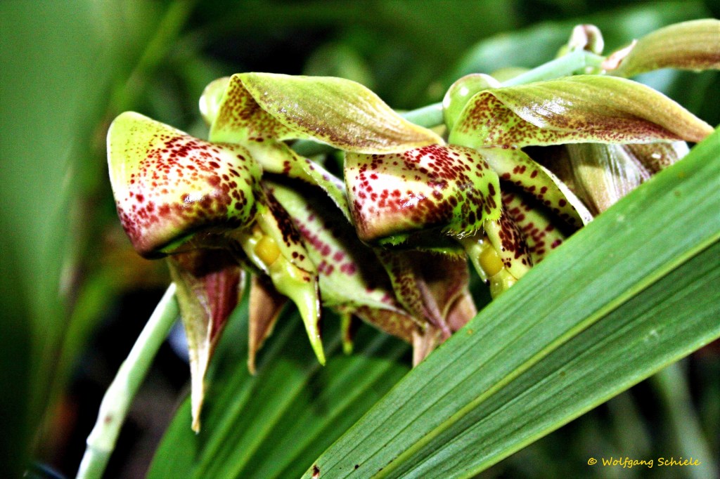 Jahrelang hatte ich in Projektgruppen meines Konzerns in Hannover zu tun. Gleich zu Beginn meiner Dienstreisezeit dorthin wurde ich auf das Orchideenhaus im Berggarten der Herrenhäuser Gärten aufmerksam. So entstanden dort ab 2008 viele Bildserien. Es ist eine der umfangreichsten Orchideenaufzuchthäuser Europas, wenn nicht sogar der Welt. Ich habe das Schauhaus immer mit Inbrunst und Demut betreten; es war für mich jedes mal wie eine Reise in eine andere Welt. Da das Haus recht klein, gut bestückt und oft auch sehr gut besucht ist, war es jedes mal eine fotografische Herausforderung, die Pflanzen auch ohne störende Vorder- oder Hintergründe angemessen in Szene zu setzen. Auch in der heutigen Serie ist eine Orchidee aus Hannover dabei, und zwar als viertes Bild: das Catasetum