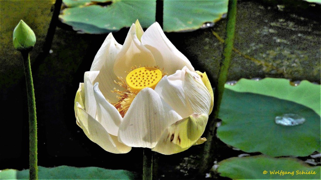 Im Botanischen Garten Pamplemousses auf der Insel Mauritius ist das große Bassin mit seinen weißen Lotusblumen ein absoluter Besuchermagnet – hier ein Ende Oktober 2019 aufgenommenes erblühtes Exemplar#