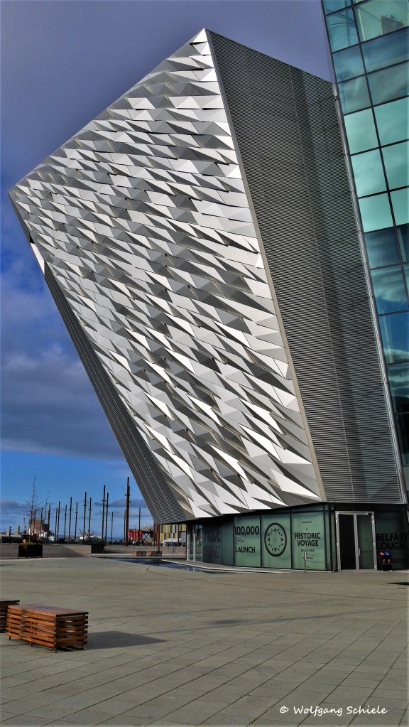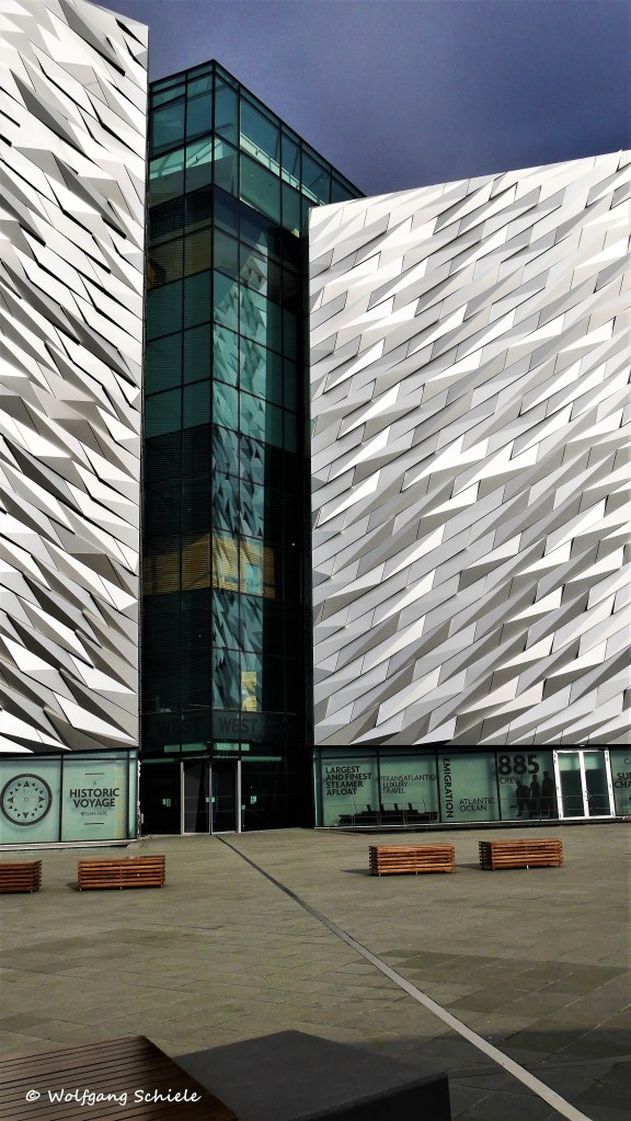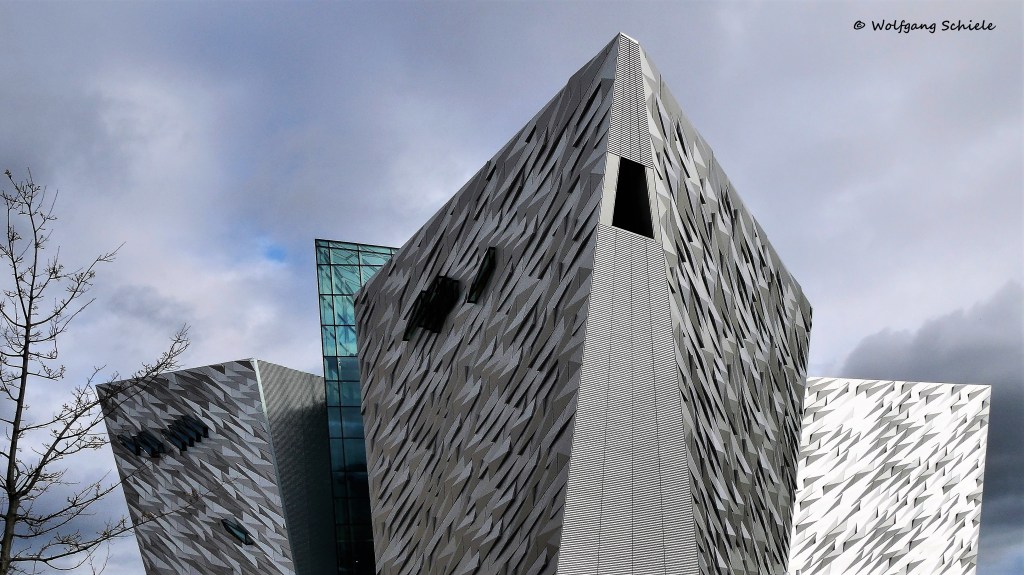 Manche Architekturobjekte bieten sich an, aus verschiedenen Blickwinkeln, mit abweichenden Einstellungen und unterschiedlichen Techniken fotografiert zu werden. Daraus können dann Serien entstehen, die für ihre Wiedergabe am besten in Galerien oder andersgearteten Compilations zusammengefasst werden. Ein solches Objekt habe ich beispielsweise in Belfast aufgenommen – das Titanic-Museum. Da beim ersten Besuch die Zeit zu knapp war und auch die Lichtverhältnisse eher suboptimal, entschloss sich unser Reiseleiter zu einer zweiten Stippvisite am Folgetag. Was sich positiv auf die Aufnahmequalität auswirkte.