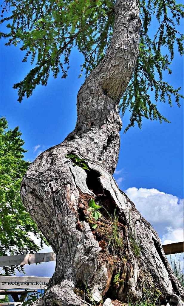 In jedem meiner Urlaube – ob in Deutschland oder im Ausland – bin ich auf der Suche nach Bäumen, die mich faszinieren und die mit ihrem Wuchs über ihr (langes) Leben Auskunft geben. Die gezeichnet sind von Wind und Wetter, von Sonne und Schnee, von Frost und Hagelschlag, von den aktuellen klimatischen Veränderungen. Oder auch von denen, die in der Lage sind, sich (fast) allen Unbilden der Natur entgegenzustellen und anzupassen. Wen man nur die Augen aufmacht und ganz bewusst Ausschau hält, dann findet man fast überall die Zeitzeugen, die seit weit mehr als einem Menschenleben über die Geschichte unserer Erde wachen.