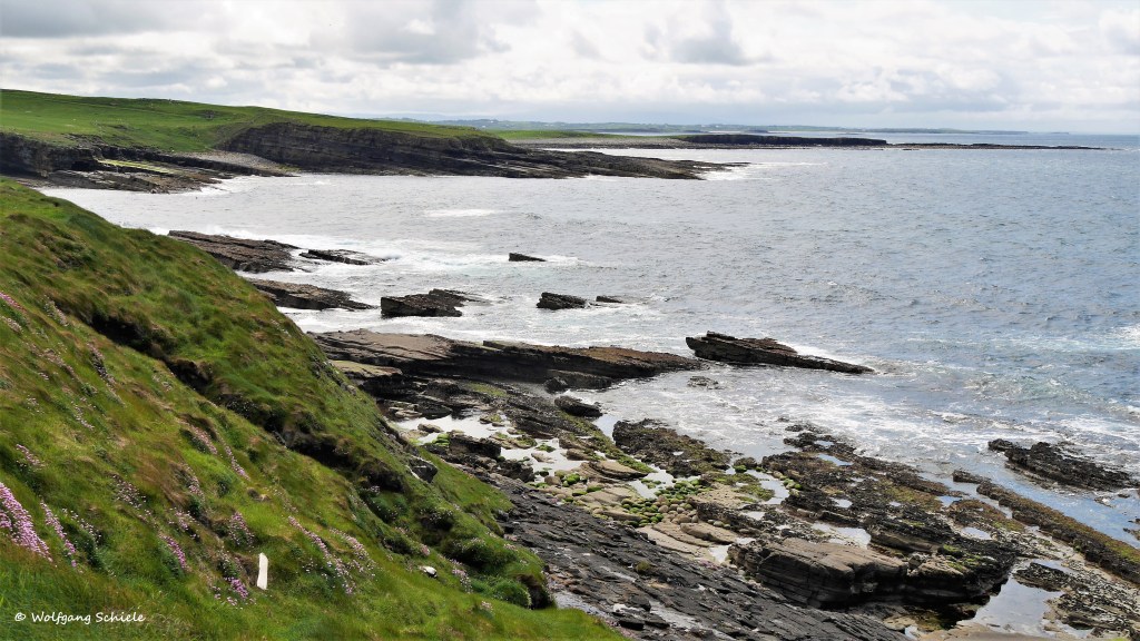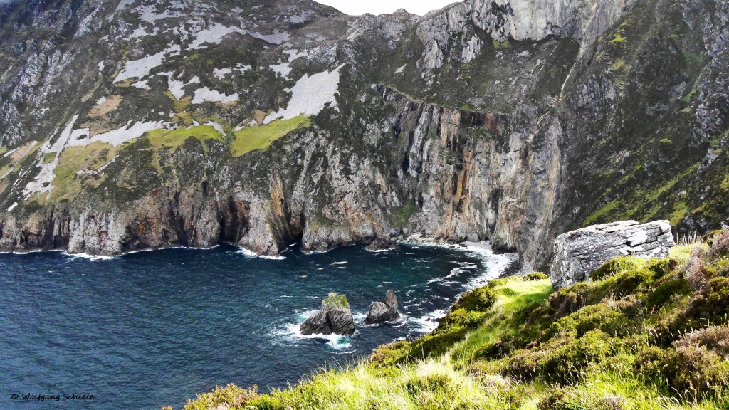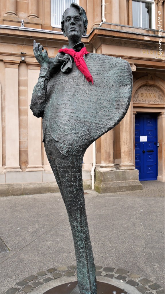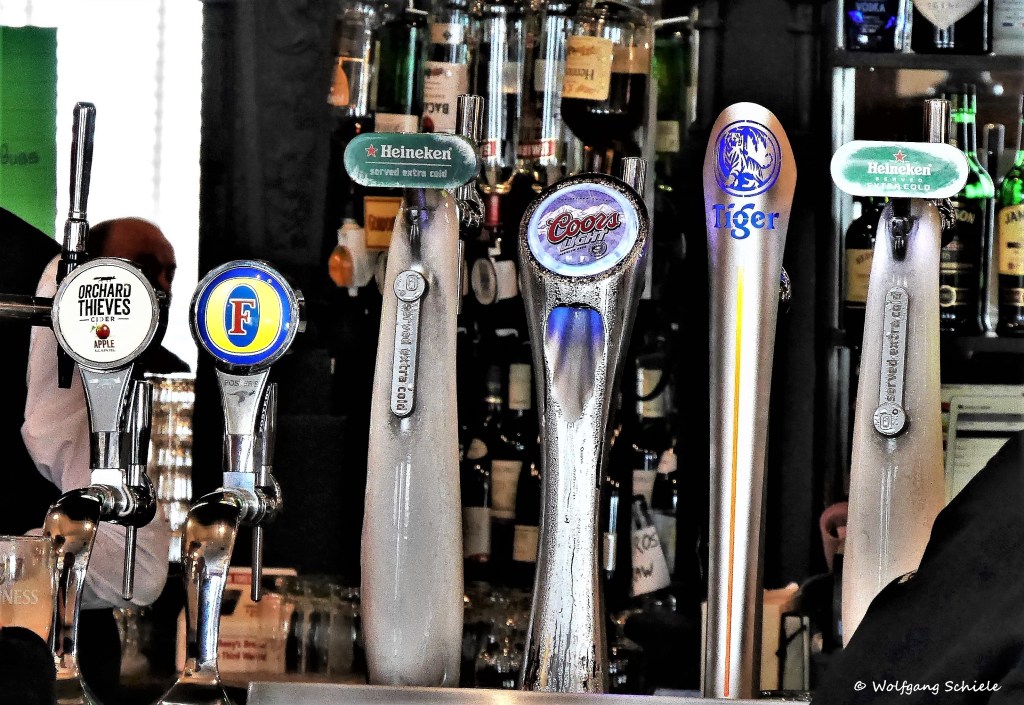 Die irische Küste ist unwahrscheinlich formen- und facettenreich und bietet immer wieder einen Anlass zum ZwischenstoppGehöfte mit den für Irland so typischen Natursteinmauern – sie grenzen das Eigentum ab, dienen als Tierkoppeln und schützen vor BodenerosionIn den Mooren wird Torf als Brennstoff fürs Haus und zum Brennen des Whiskeys gewonnenWerbliche und formschöne „Zapfsäulen“ in einem typisch irischen PubViel Schiffsverkehr im Hafen von DonegalDonegal Castle aus dem 15. Jahrhundert – halb Ruine, halb wiedererstandenes MuseumInteressante Holzdeckenkonstruktion im erhaltenen Teil des SchlossesEin Ausflug mit Minibussen (im Hintergrund) und ein steiler Aufstieg zu einem Aussichtspunkt an den 600 m hohen Klippen von Slieve LeagueDie Slieve-League-Klippen – die höchsten in Irland„Ben Bulben“ – der sagenumwobene Tafelberg der IrenW. B. Yeats – einer der irischen Literaturnobelpreisträger (1923) Und nochmal W. B. Yeats – über seinem Werk sinnierendIn Carrowmore besichtigen wir eines der größten Megalithgräberfelder IrlandsZum Tagesausklang ein weiter Blick auf die Irische See mit vorgelagerten Klippen