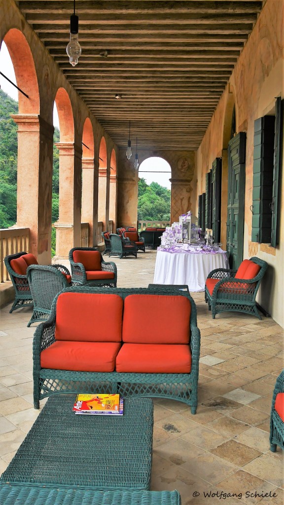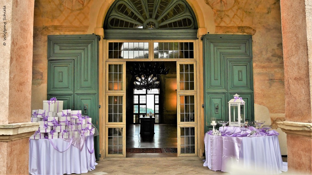 Ein Blick nach draußen auf die großzügigen Treppenaufgänge und die Nebenanlagen der eigentlichen VillaPrachtvoller Steingut-Tischschmuck strebt hinauf zu den den vielfarbigen LampenEine der festlich geschmückten Terrassen mit den original restaurierten FreskenDie Euganeischen Hügel wurden 1989 zum ersten Naturpark der Region Venetien ernanntEin künstlerisches Kleinod – in freier fantasievoller AusführungGang im Untergeschoss der Villa dei VescoviDrei Damenbüsten aus GlasEines der vier monumentalen Tore des VillengartensDer Blick schweift durch die Prachtportale entlang der Geschenketische für das HochzeitspaarEin Abschiedsblick durch eines der vier Tore
