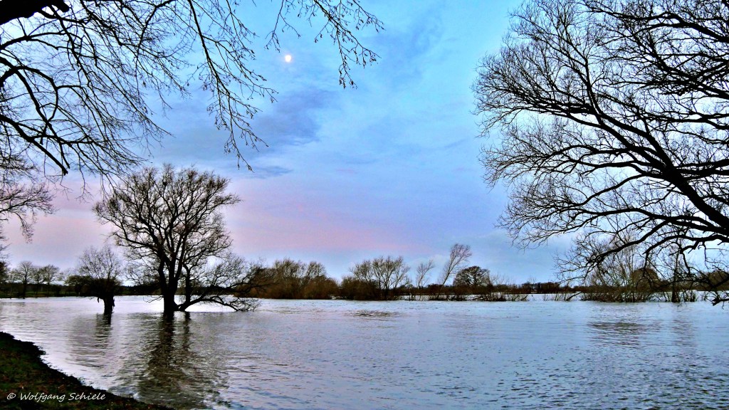 Viel „Festland“ war am Morgen des 30. Dezember 2023 zwischen Aller und Bosse, einem Ortsteil von Frankenfeld, nicht mehr – und der Mond schaut traurig zu …