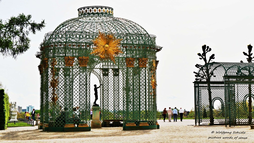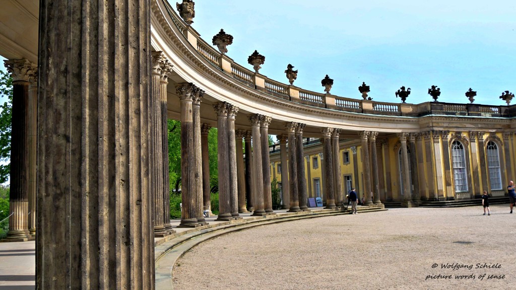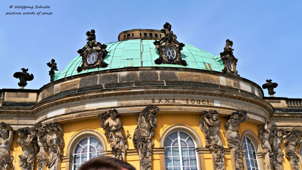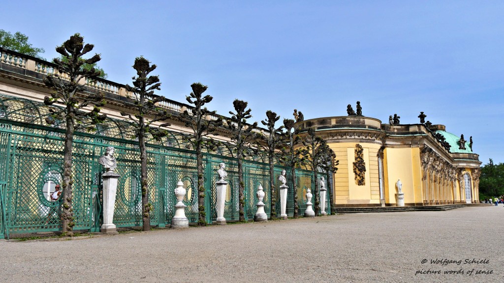 Auf der dem Garten gegenüberliegenden Seite kamen die Gäste des Hofes früher mit ihren Kutschen anDer „Alte Fritz“ spielte als Schöngeist selbst Querflöte – heute flötet ein Schauspieler für die TouristenEine Rokokovase hinter dem Gitter eines LaubengangesDie „Halb-„Fassade des Schlosses Die prächtig umrahmte Dachkuppel von Schloss SanssouciGartenpavillon mit Sonnensymbol und JünglingsfigurNatürlicher Laubengang – im Hintergrund die Bildergalerie des Schlosses Sanssouci – sie zählt zu den schönsten und ältesten Museumsbauten DeutschlandsVier afrikanische Büsten stehen hier im Kreis – das frühere „Mohrenrondell“ wurde 2021 in „Erstes Rondell“ umbenannt