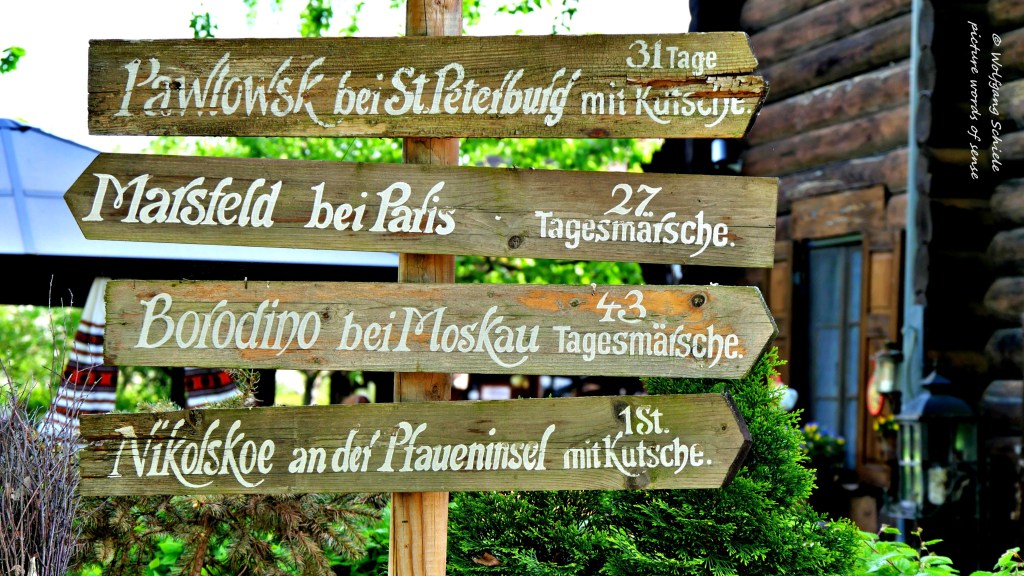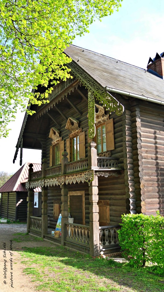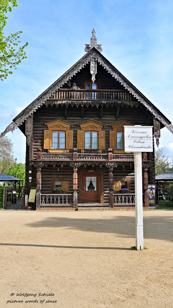 Alles befindet sich in einem gut restaurierten Zustand – und erweckt den Eindruck, dass hier noch emsiges Treiben herrschtEinige der Häuser sind Museum, die man zu bestimmten Zeiten mit einer Führung besuchen kannMit der Errichtung der Kolonie wurden große Obstplantagen für die Selbstversorgung angelegt, die noch heute bewirtschaftet werdenPrachtvoll geschnitzte Details an einem HolzhausEingang zu einem MuseumshausAm Ende der Kolonie befindet sich die Alexander-Newski-Kirche, die der Bauprofessor Karl Friedrich von Schinkel in einer Mischung aus traditionell russischer und preußisch-klassizistischer Architektur schuf