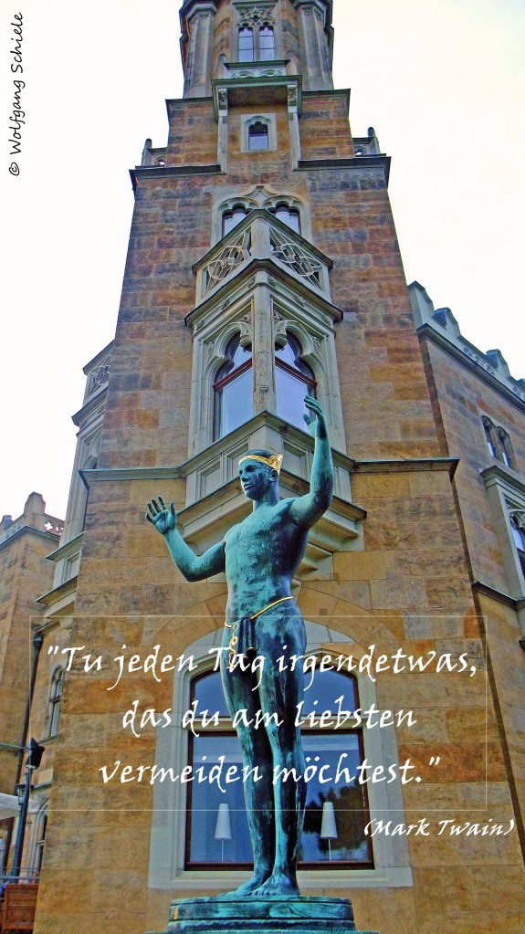 Zur Erklärung: Das ist (im Hintergrund) das neugotische Schloss Eckberg an der Elbe in Dresden. Die Figur soll ein Pharao sein. Das Schloss im Tudorstil wurde um 1860 durch den Großkaufmanns Johann Daniel Souchay errichtet und ist heute Hotel (in dem ich übrigens vor vielen Jahren auch meine Silberhochzeit gefeiert habe …)
