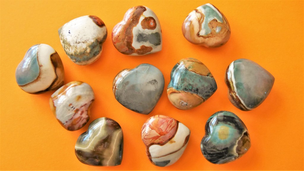 Durch einen Zufall stieß ich auf einen „Restposten“ meiner Schmeichelsteine. So nennt man Steine, die glatt geschliffen und poliert eine naturbelassene Ästhetik ausstrahlen und gut in der Hand liegen. Daher auch Handschmeichler genannt. Ich habe sie oft in meinen Seminaren genutzt, um z. B. assoziative Anker zu setzen oder sog. „Affektbrücken“ in die Vergangenheit zu bauen. Sie haben alle die Form kleiner Herzen und verfügen über wunderbare Farbbilder (siehe oben). Nun haben sie ihren neuen Platz in der Vitrine auf einer Glasplatte eingenommen. Jedes Mal, wenn ich das Licht in der Vitrine einschalte oder die Glastür zu ihr öffne, bekommen sie durch die kleine Erschütterung einen Impuls und beginnen wegen der äußerst geringen Reibung auf dem Glas hin und her zu schaukeln. Für mich sind es die zitternden Herzen, die mich mit ihrer Bewegung zu begrüßen scheinen …