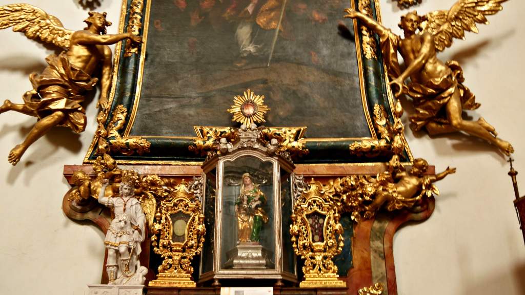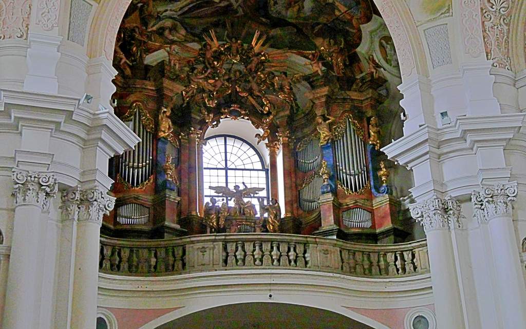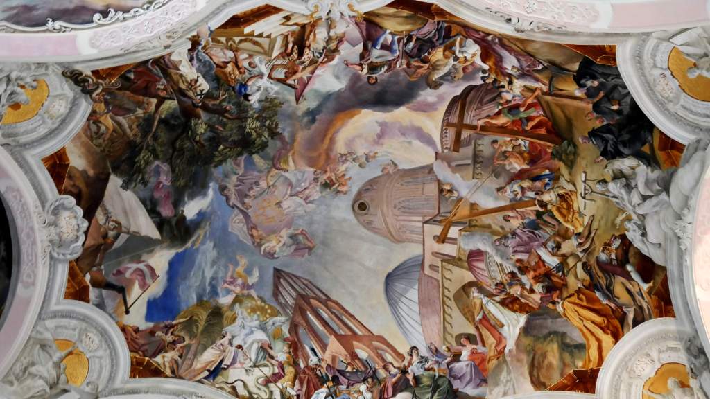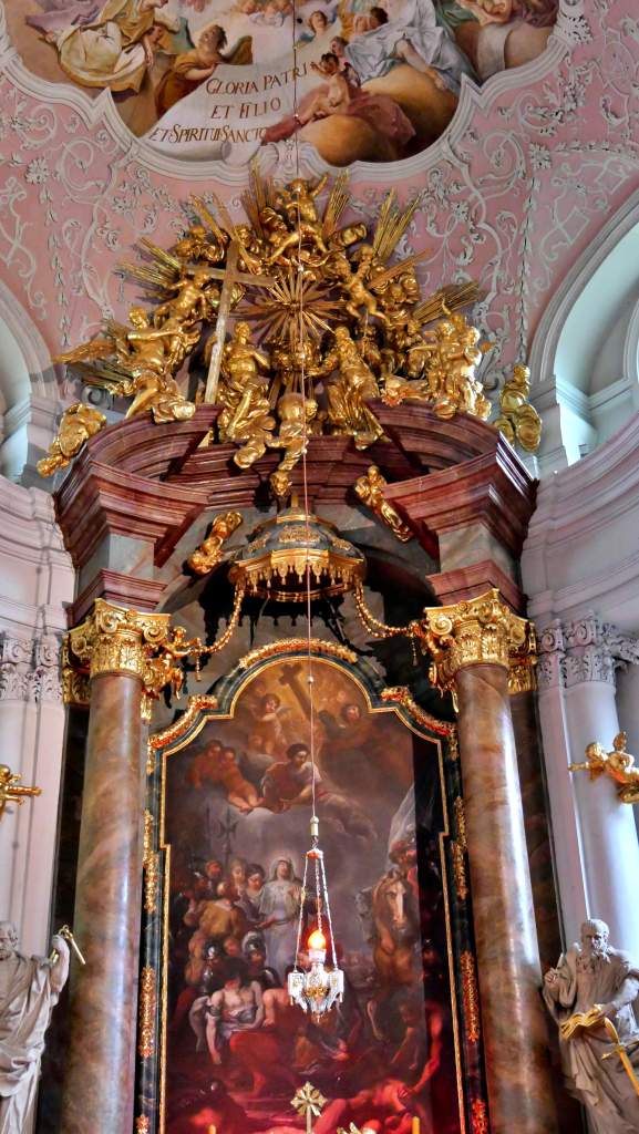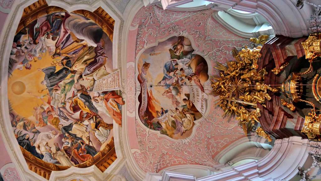 Die Fresken und Gemälde erzählen von der Schlacht gegen die Mongolen, die Auffindung des geköpften Führers der Abendländler, Herzog Heinrich, und von der Auffindung des Heiligen Kreuzes. Lebendig und dramatisch in Szene gesetzt vom Münchner Maler Cosmas Damian Aman im Jahre 1733. Diese Pracht lassen wir uns für´s Fotografieren gern 10 Zloty kosten …