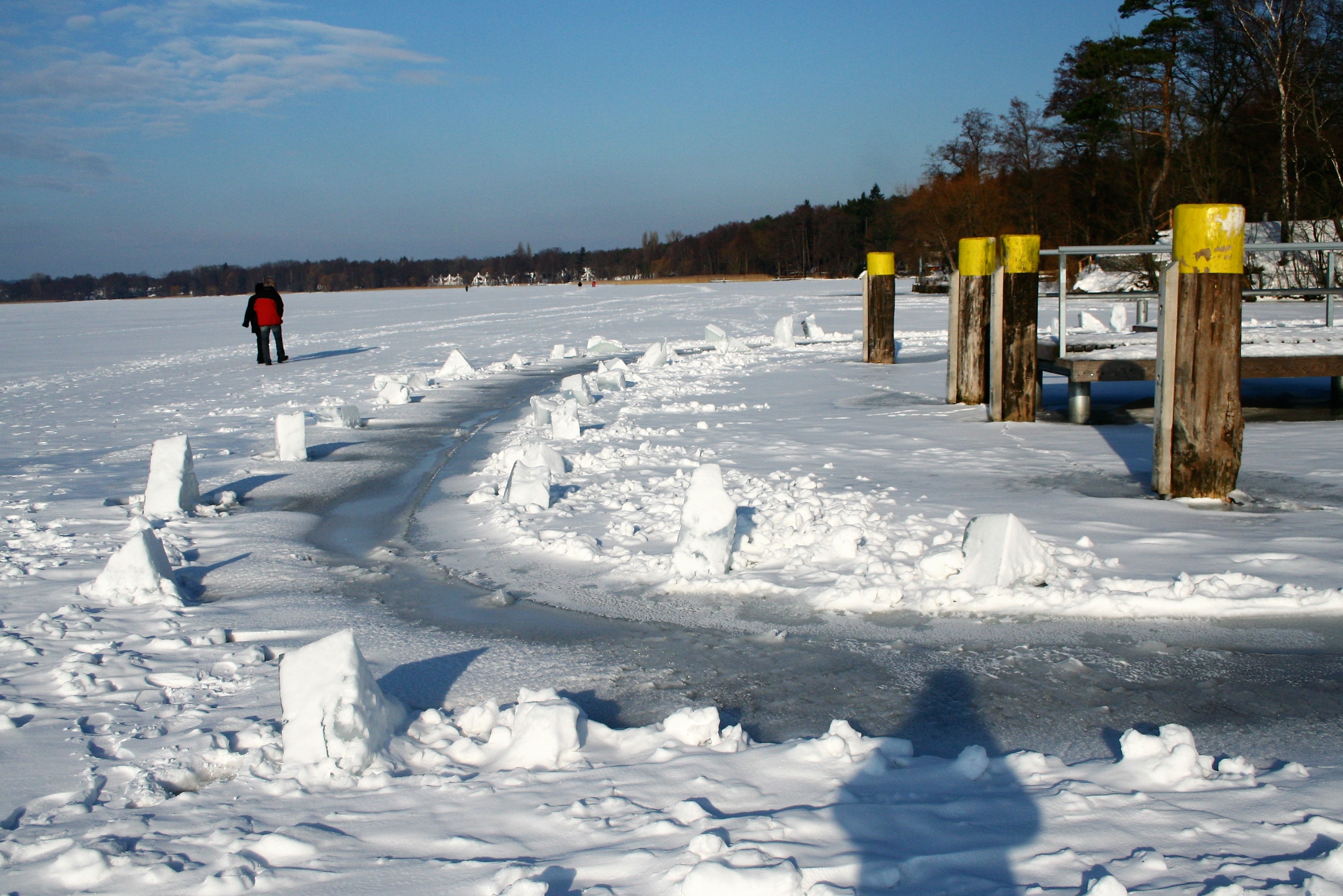 Die Natur vermag uns immer wieder zu verblüffen. Nach einigen eisigen Nächten hatte sich auf dem Scharmützelsee eine dünne Eisdecke gebildet, die durch einen steten und forschen Wind aufriss. Die großen Schollen brachen und trieben als kleine Eisplatten an das Ostufer. wo sie anlandeten und sich aneinander rieben. Durch die vielen kleinen Zusammenstöße, die die schaukelnden Wellen verursachten, entstand eine klirrende und klappernde Melodie, als ob Metallplatten gegeneinander stießen. Neben dem imposanten Schauspiel auch ein bemerkenswertes Hörspiel! Das Eismeer vor der Haustür – und auch ein kleines, unerwartetes Fotoerlebnis. Viel Spaß beim Schauen! Und wer ganz genau hinhört, kann das Scheppern und Klappern der kleinen Eisschollen bestimmt auch hören …