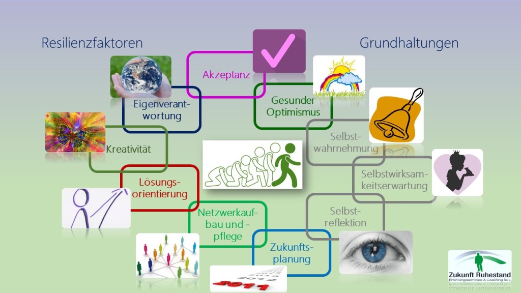 Die Resilienzforschung kennt verschiedene Ansätze zu den Säulen und Einstellungen, die den Menschen gegen die verschiedenen Wechselfälle des Lebens, gegen Stress und Transformationsängste psychologisch widerstandsfähiger machen können. Mein Favorit ist auf der vorangehenden Abbildung zu sehen: sieben Resilienzfaktoren und drei lebensbedeutsame Grundeinstellungen.